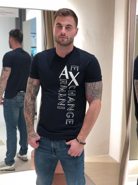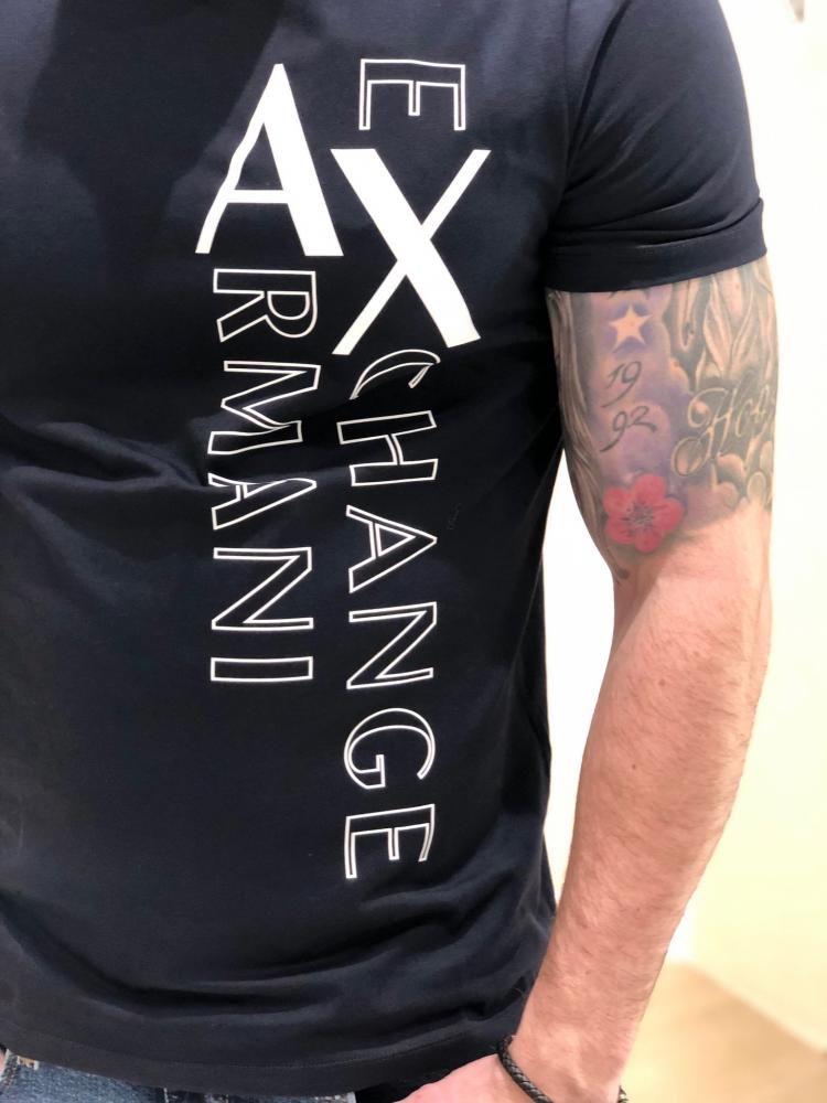 PREVEDENIE: Tričko z kolekcie Armani Exchange v tmavomodrom farebnom prevedení. Pánske slim fit tričko s krátkym rukávom a s okrúhlym výstrihom. Na tričku sa nachádza zvisle veľký nápis .