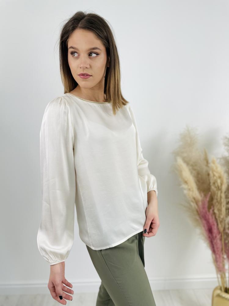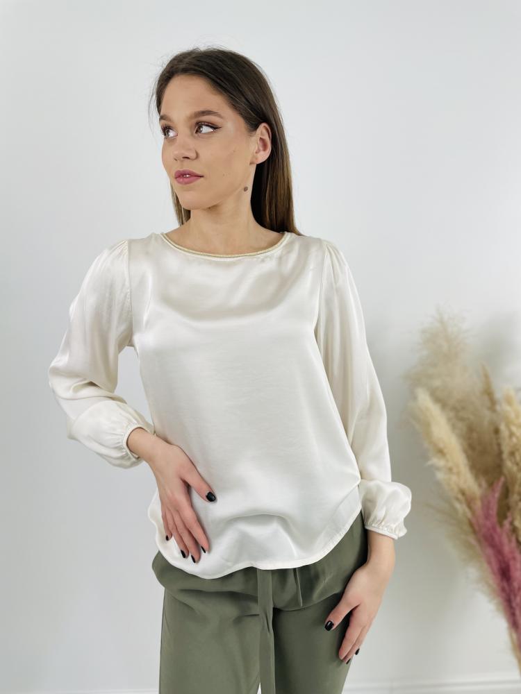 Dámsky béžový top s dlhým rukávom, s okrýhlym výstrihom zdobený zlatou niťou. Top má príjemný, ľahký amteriál.