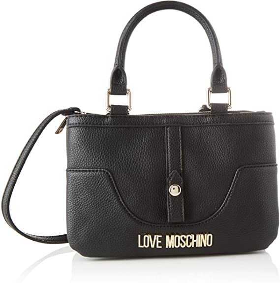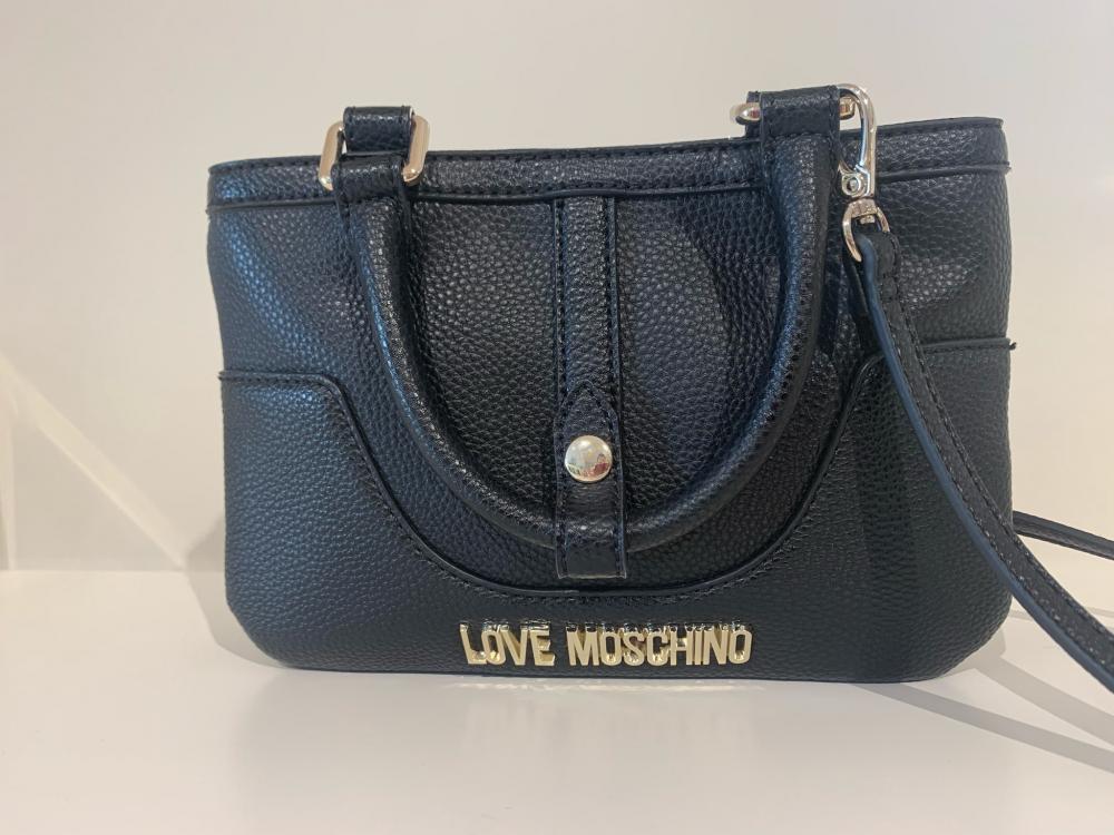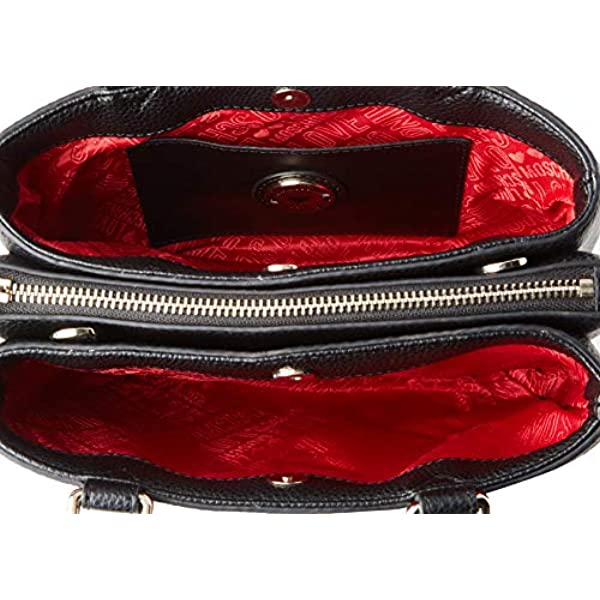 Čierna kabelka Love Moschino s troma priehradkami a červeným vnútrom. Kabelka s možnosťou nosenia cez rameno, alebo do ruky.