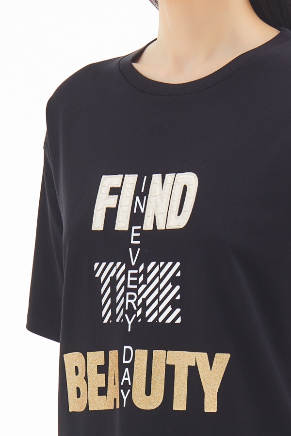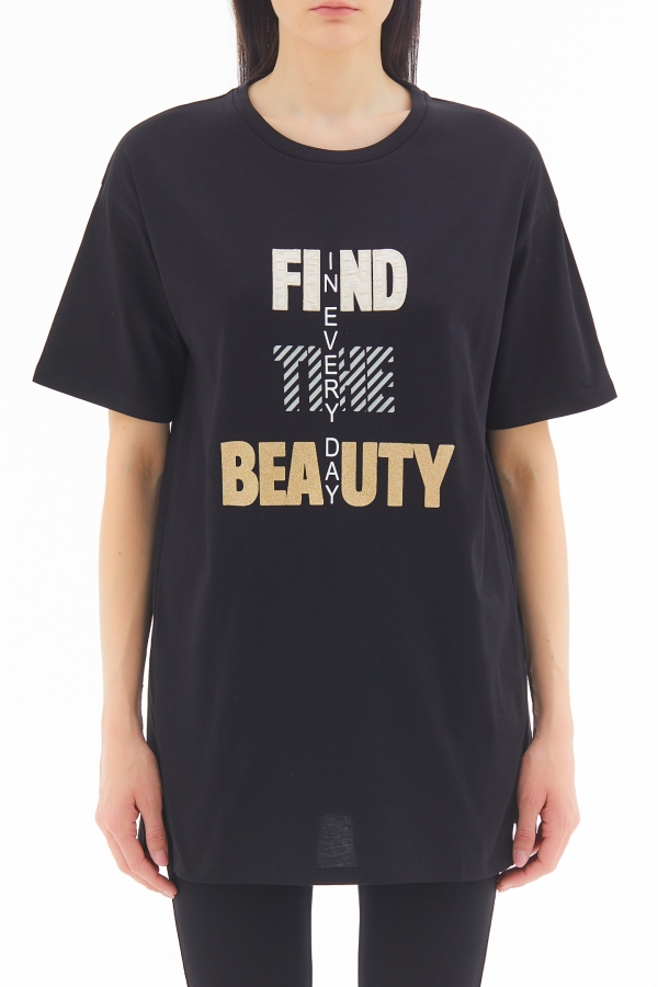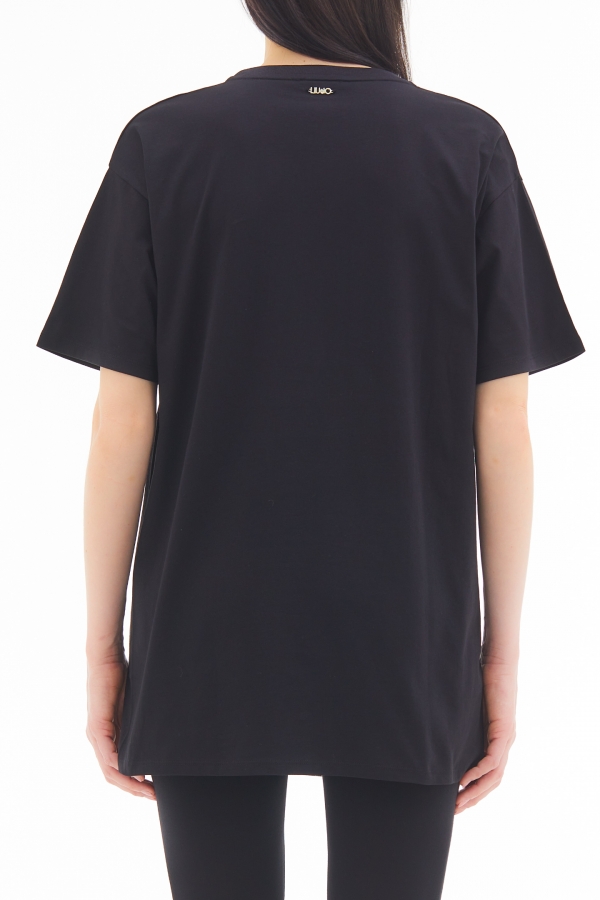 Čierne predĺžené tričko Liu Jo . Tričko má v predu nápis . Dĺžka trička je do pólky stehien .