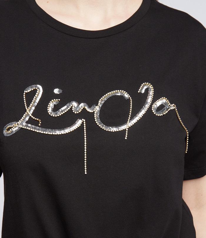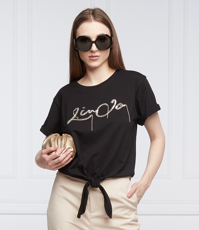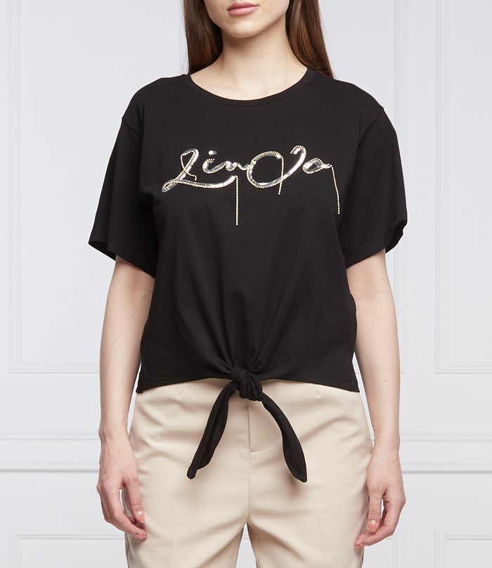 Čierne LIU JO tričko s flitrami a retiazkami na prednej strane. Tričko s krátkym rukávom a okrúhlym výstrihom. Rovný strih. Vpredu dole na zaviazanie.