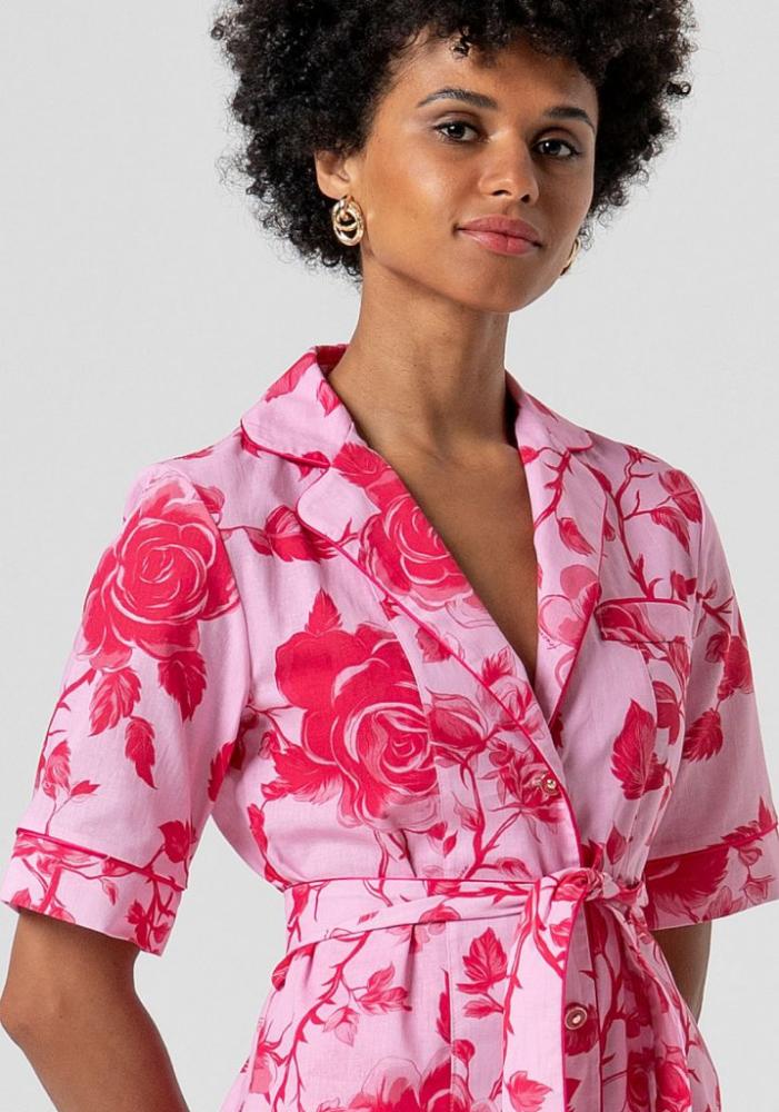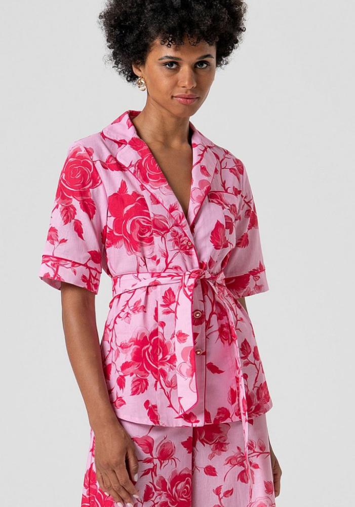 Model okamžite upúta pozornosť výraznou potlačou rozkvitnutých červených ruží na jemnom ružovom podklade. Dizajn inšpirovaný uvoľneným, no šik štýlom spája elegantný chlopňový golier a krátke rukávy s decentným lemovaním. Kľúčovým detailom je ladiaci látkový opasok, vďaka ktorému si môžete top stiahnuť v páse a nádherne tak definovať svoju siluetu.