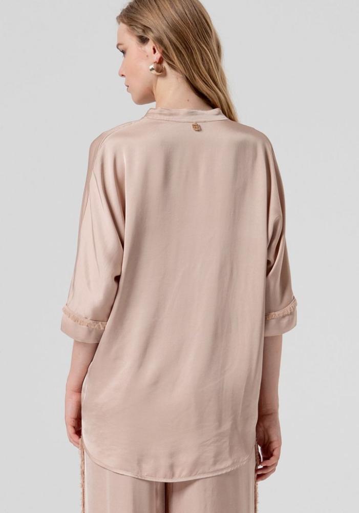 Púdrová saténová košeľa od značky Fracomina je dokonalým vyjadrením ležérneho luxusu a nenútenej elegancie. Tento kúsok si vás okamžite získa svojou neuveriteľnou ľahkosťou a jemným leskom, ktorý rafinovane podčiarkne vašu ženskosť.