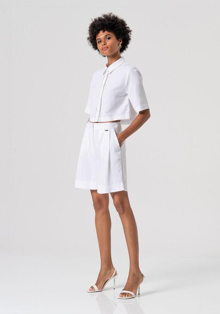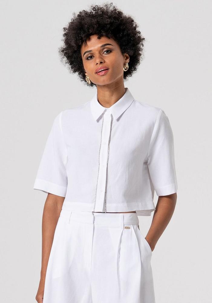 Snehobiela skrátená košeľa od značky Fracomina predstavuje moderný a mimoriadne šik pohľad na absolútnu klasiku dámskeho šatníka. Tento kúsok dokonale spája minimalistický dizajn s jemným dotykom glamouru, vďaka čomu oživí váš každodenný štýl.