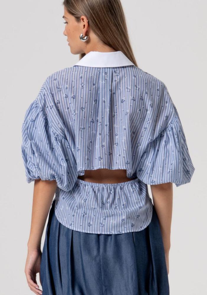 Model na prvý pohľad zaujme sviežou kombináciou modro-bielych prúžkov a jemnej potlače drobných kvetov. Kontrastný snehobiely golier dodáva košeli punc elegancie, zatiaľ čo výrazné, bohato naberané balónové rukávy vnášajú do dizajnu nádych letnej romantiky a aktuálnych trendov.