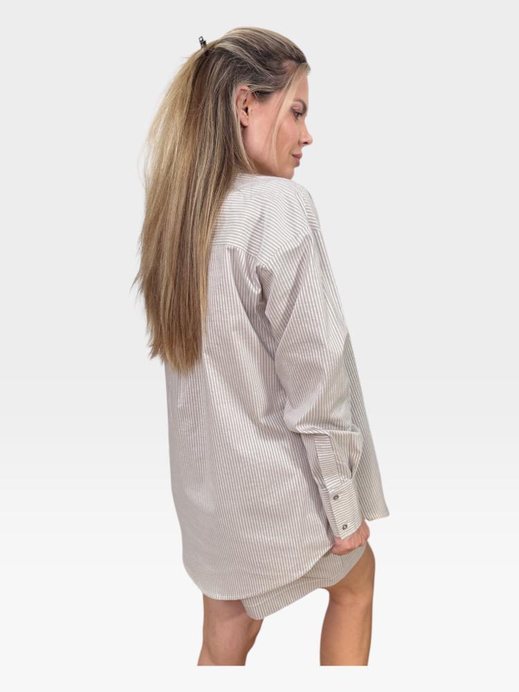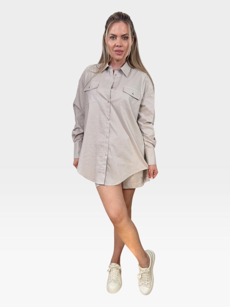 Model zaujme na prvý pohľad svojím nadčasovým dizajnom s vertikálnymi prúžkami v jemných pieskovo-bielych tónoch, ktoré pôsobia veľmi čisto a dovolenkovo. Košeľa má mimoriadne obľúbený, voľný "oversize" strih s padnutými ramenami, vďaka čomu zaručuje maximálnu vzdušnosť a celodenný komfort. Dizajn je oživený výraznými náprsnými vreckami s chlopňou a drobným kovovým gombíkom, čo modelu prepožičiava jemný a veľmi štýlový "utility" (safari) nádych. Klasický golier, zapínanie na ladiace gombíky a dlhé rukávy so širšími manžetami dotvárajú jej ucelený a prepracovaný vzhľad.