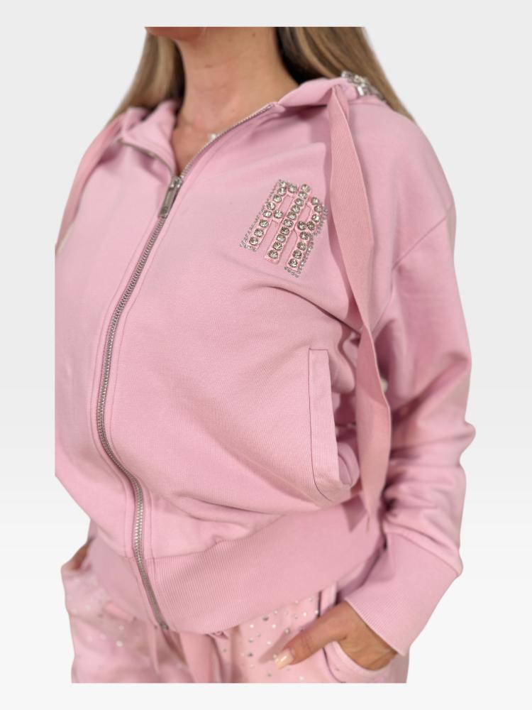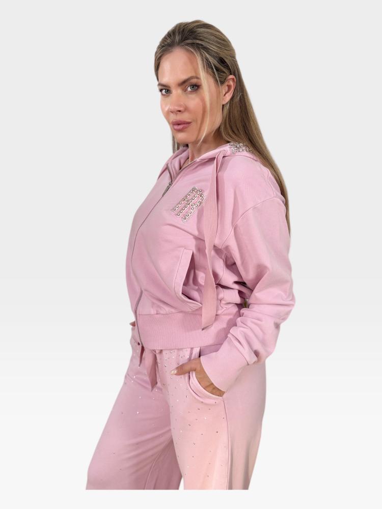 Model si vás okamžite získa svojím jemným, pastelovo ružovým odtieňom a príjemným materiálom. Mikina má klasický, voľnejší strih s praktickým zapínaním na kovový zips po celej dĺžke a priestrannou kapucňou so širokými sťahovacími šnúrkami, ktoré sú štýlovo zakončené kovovými detailmi. Spodný lem a rukávy sú ukončené širokými rebrovanými manžetami, ktoré zabezpečujú, že mikina perfektne sedí na postave a krásne drží tvar. Absolútnou dominantou a luxusným šperkom tohto inak ležérneho kúsku je však výrazná aplikácia na ľavej strane hrude, ktorá je bohato vykladaná trblietavými kamienkami.