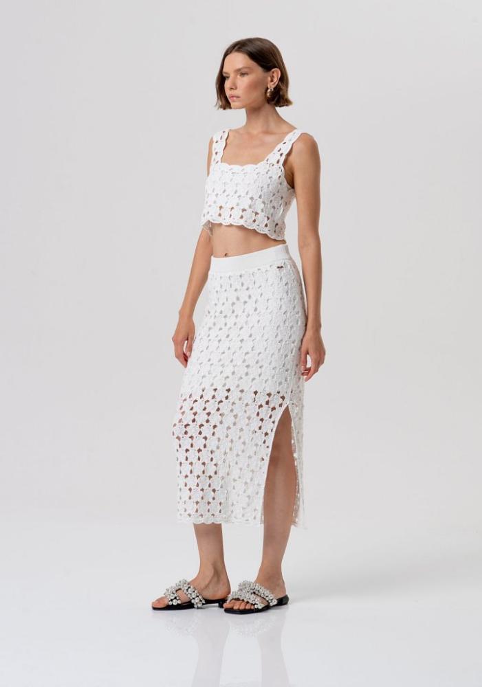 Model upúta pozornosť nádherným háčkovaným dizajnom s kvetinovým motívom, ktorý rafinovane presvitá a pôsobí mimoriadne žensky. Pohodlný elastický pás sa krásne a bez námahy prispôsobí vašej postave, zatiaľ čo elegantná midi dĺžka je doplnená o zmyselný bočný rázporok. Ten dodáva sukni úžasnú dynamiku a pri každom kroku nechá jemne vyniknúť vaše nohy.