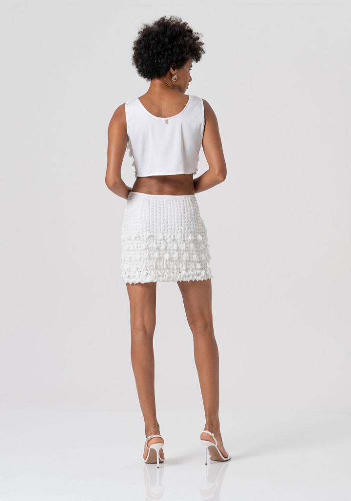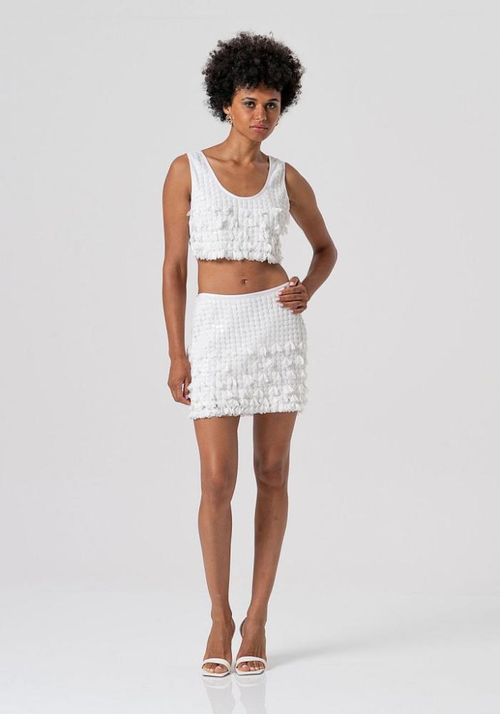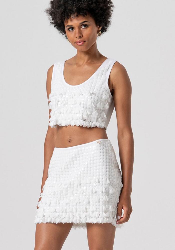 Model si vás okamžite získa svojou originálnou a bohatou textúrou. Celá plocha sukne je husto posiata veľkými, matnými bielymi flitrami (pripomínajúcimi drobné lístky alebo peniažteky), ktoré vytvárajú fascinujúci 3D efekt a dodávajú modelu dynamiku pri každom pohybe. Priliehavý mini strih dokonale zvýrazňuje nohy a ženskú siluetu. Hladký, úzky lem v páse zaisťuje pohodlné nosenie a je vkusne doplnený o drobný, elegantný kovový detail s logom značky na ľavej strane.