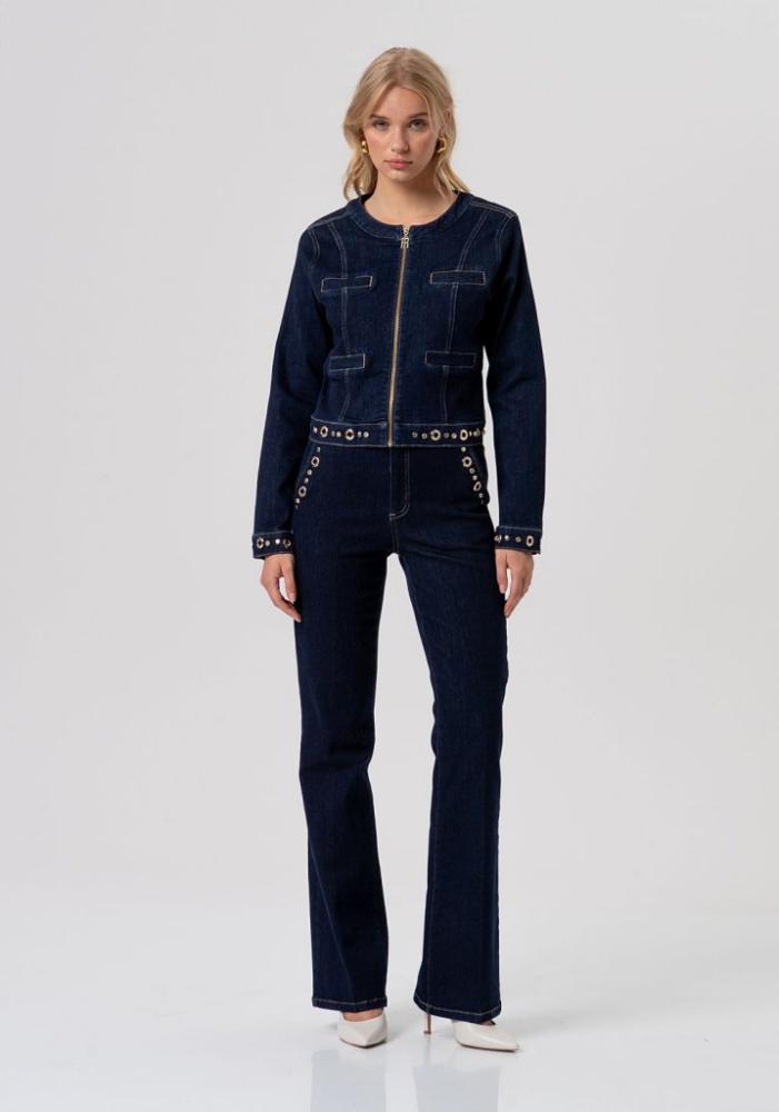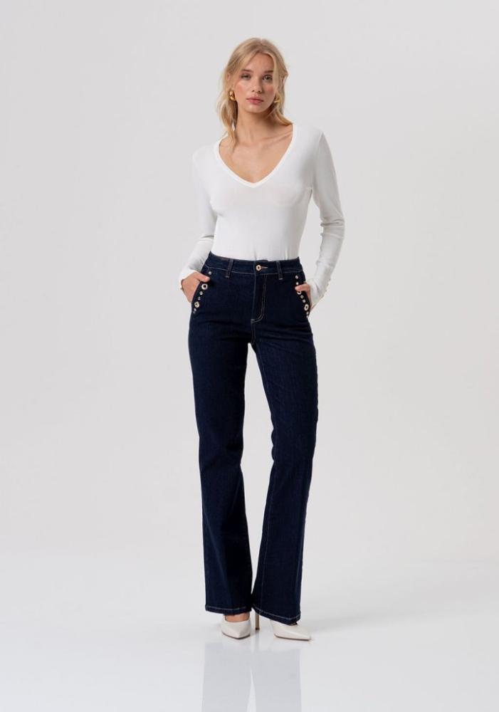Luxusné detaily: Výrazné zlaté aplikácie a gombíky lemujúce predné vrecká dodávajú džínsam nezameniteľný a elegantný charakter.