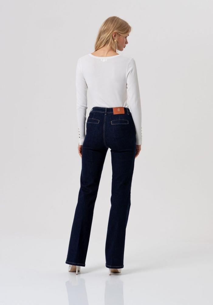 Lichotivý strih: Mierne zvonový strih (bootcut/flare) v kombinácii so stredne vysokým pásom krásne formuje postavu a opticky predlžuje nohy.