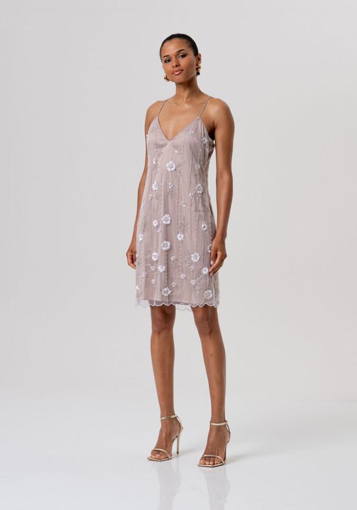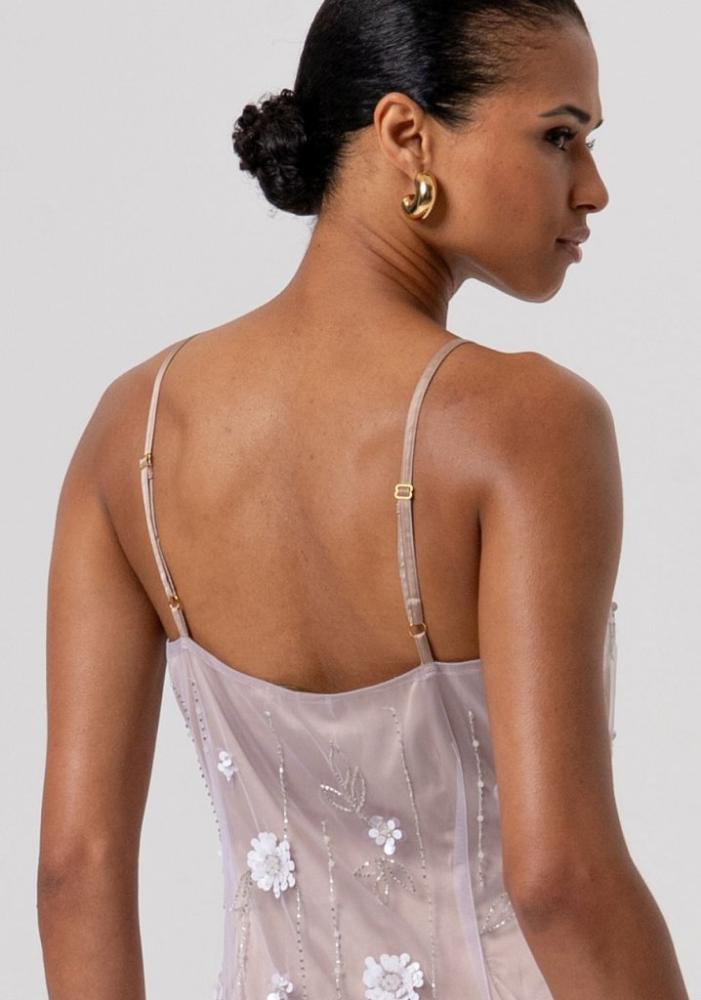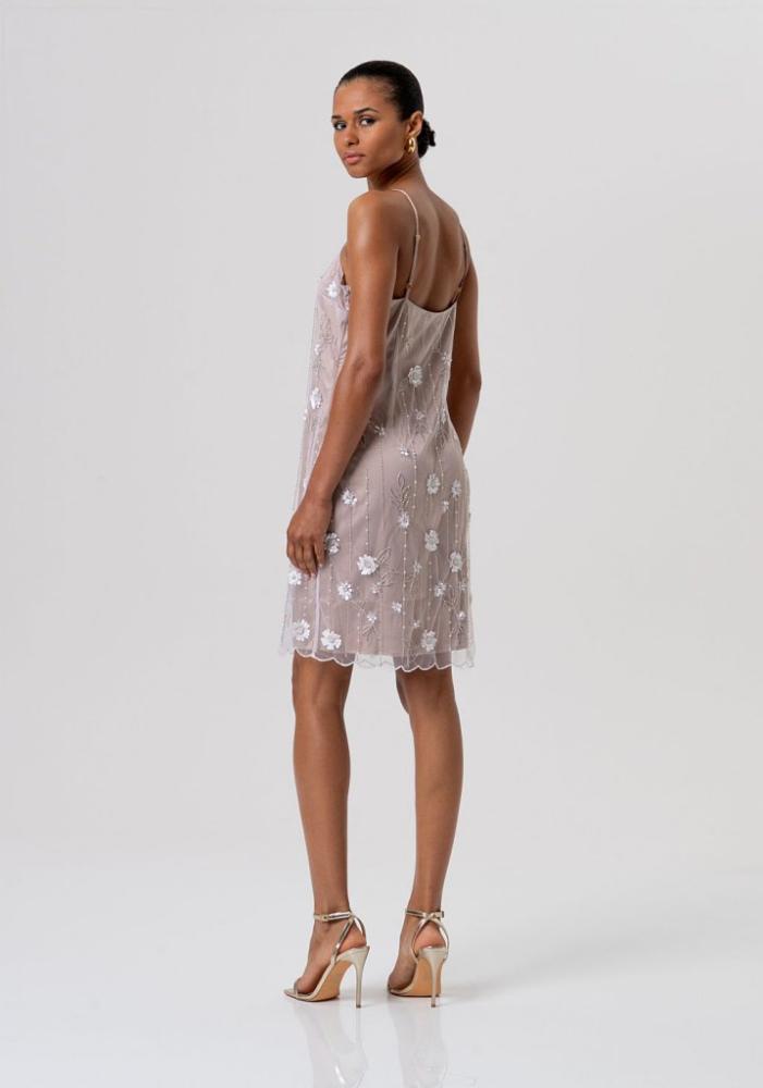 Kvetinová poézia. Tieto šaty Fracomina sú stelesnením jemnej ženskosti a romantiky. Na telovom (nude) podklade sa vyníma priehľadná tylová vrstva, ktorá je bohato posiata 3D kvetinovými aplikáciami a jemnými korálikmi. Sú to šaty pre ženu, ktorá chce pôsobiť krehko, no zároveň nezabudnuteľne. Ideálne na letnú svadbu, záhradnú slávnosť alebo romantické rande.