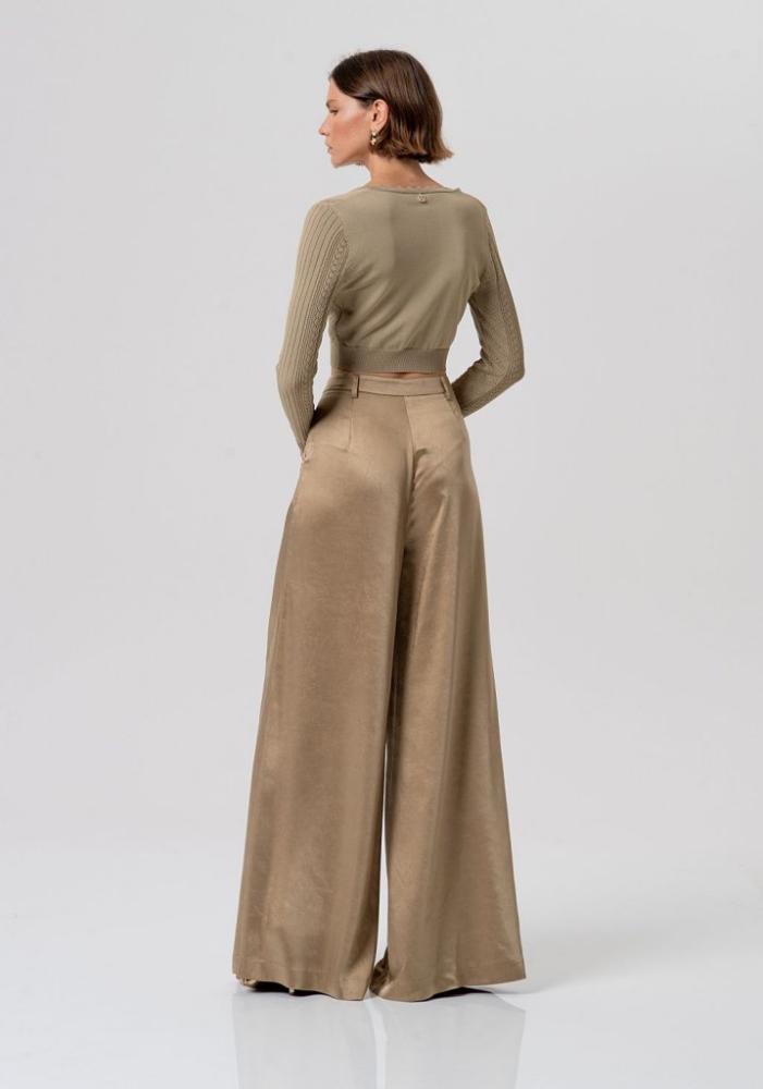Vneste do svojho šatníka dávku luxusu s týmito exkluzívnymi nohavicami od talianskej značky FRACOMINA. Tento model je definíciou "glamour" štýlu – kombinuje mimoriadne obľúbený široký strih (Wide Leg) s materiálom, ktorý má nádherný, jemne zlatistý saténový odlesk.