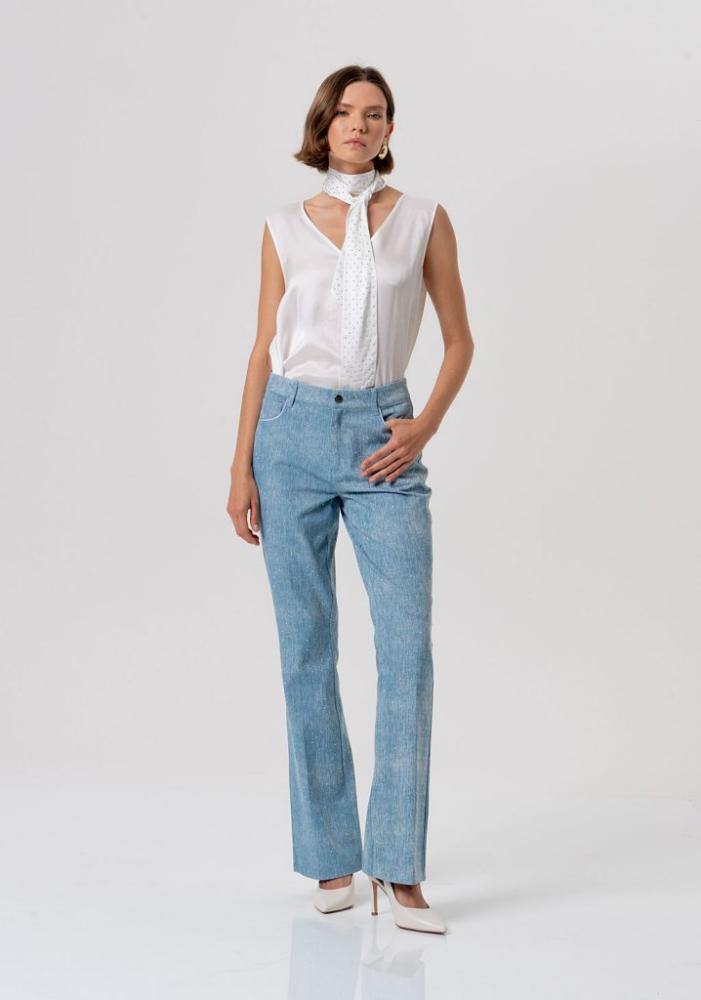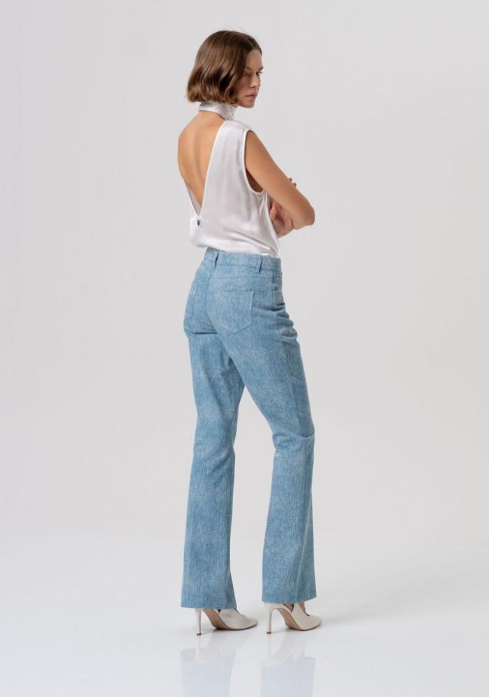 Vneste do svojho šatníka sviežosť s týmito elegantnými dámskymi nohavicami, ktoré zaujmú svojou unikátnou textúrou. Jemný svetlomodrý odtieň s „melírovaným“ efektom (pretkávaný bielou nitkou alebo jemným leskom) pôsobí mimoriadne sofistikovane a čisto.
