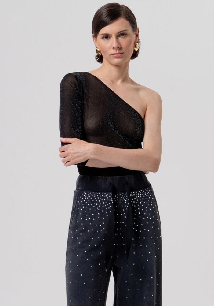 Glamour efekt: Vrchnú časť teplákov zdobia bohato roztrúsené trblietavé kamienky, ktoré postupne smerom nadol prechádzajú do stratena a dodávajú nohaviciam výnimočný lesk.