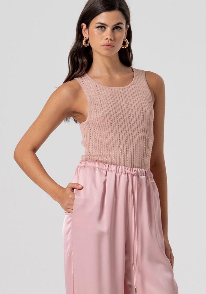 Model si vás okamžite podmaní svojím nádherným, padavým materiálom so saténovým leskom. Látka pri každom pohybe vytvára fascinujúcu hru svetla a hladko splýva pozdĺž siluety. Nohavice majú obľúbený, mimoriadne lichotivý široký strih (palazzo) s vyšším pásom, ktorý opticky predlžuje nohy. O váš celodenný komfort sa postará flexibilný elastický pás s praktickým sťahovaním na šnúrku (zdobenú kovovými koncovkami), čo modelu dodáva jemne ležérny, moderný "pyjama-chic" nádych. Punc kvality a exkluzivity decentne podčiarkuje malé kovové logo značky umiestnené pod pásom na ľavej strane.