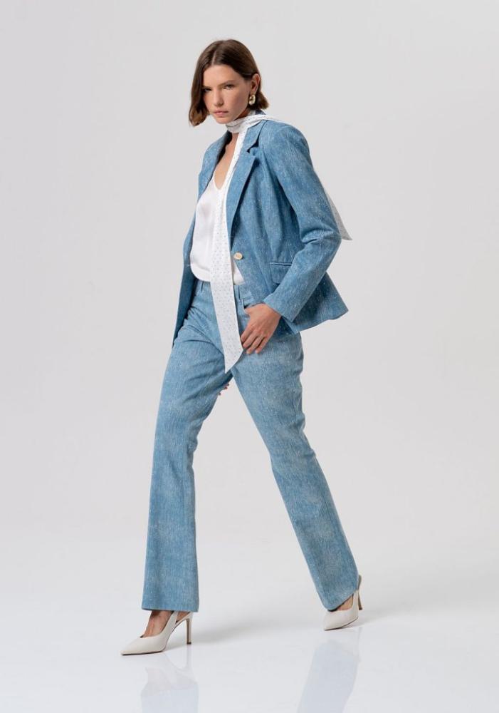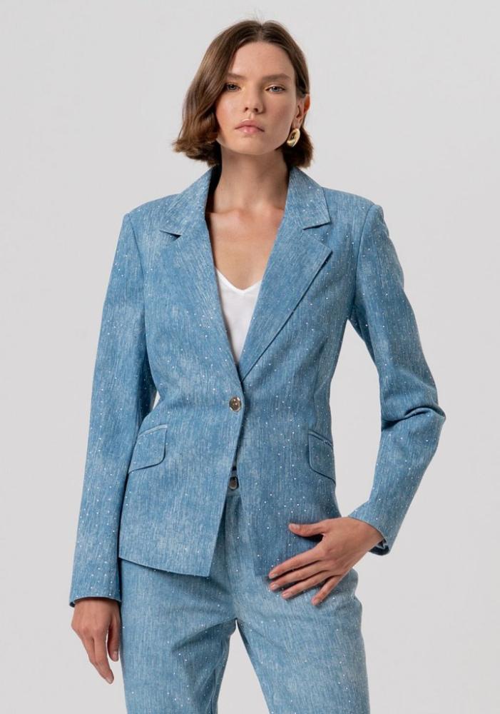 Sako je vyrobené z kvalitnej štruktúrovanej látky v svetlomodrej farbe, ktorá pripomína jemnú džínsovinu, no zachováva si ľahkosť a eleganciu kostýmového materiálu. Čo robí tento model skutočne výnimočným, je celoplošné zdobenie drobnými trblietavými kamienkami, ktoré sú rovnomerne rozmiestnené po celej ploche a vytvárajú tak decentný, no neprehliadnuteľný "glam" efekt.