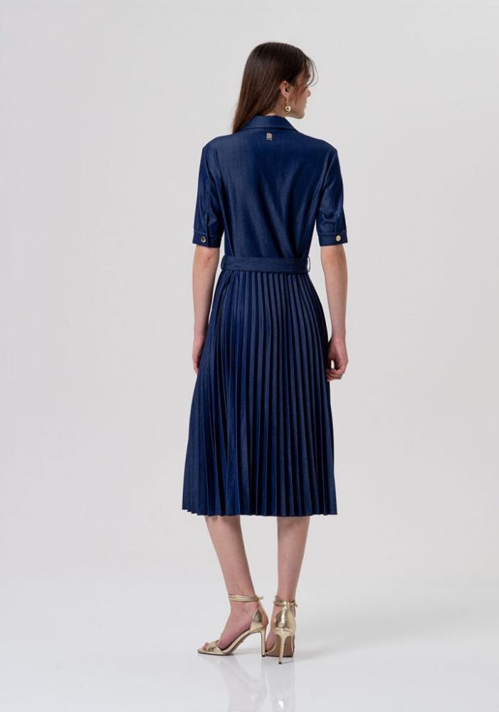 Tmavomodré denimové šaty od značky Fracomina predstavujú dokonalú súhru nadčasovej klasiky a modernej elegancie. Tento kúsok v midi dĺžke je ideálnou voľbou pre ženy, ktoré hľadajú sofistikovaný a upravený vzhľad s dôrazom na ženskosť.