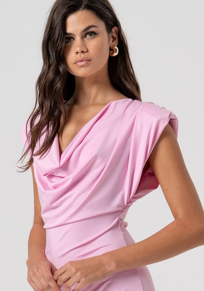 Model okamžite upúta pozornosť rafinovaným naberaným výstrihom (tzv. vodopádovým výstrihom), ktorý voľne padá a vytvára krásne tvarovaný dekolt. Tento elegantný prvok vkusne dopĺňajú prepracované rukávy s výrazným riasením na ramenách, čo dodáva šatám veľmi šik a jemne dramatický vzhľad.