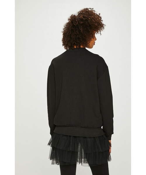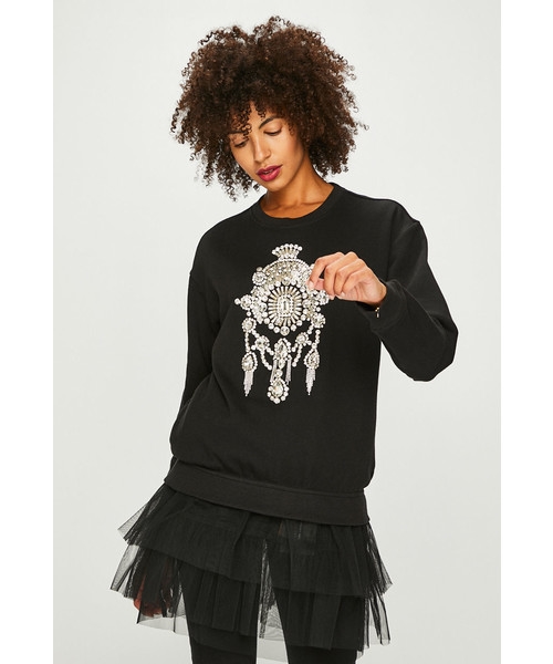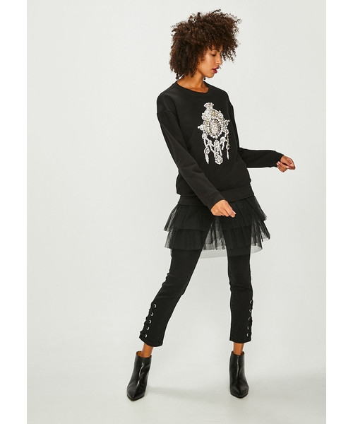 PREVEDENIE: Dámske Silvian Heach čierne šaty so spodničkou. Šaty so spodničkou ktorá sa dá dať dole a ostane len mikina. Spodnička je na ramená so zapinaním na boku na zips. Mikina so štrasovou aplikáciou na prednej strane. Mikina s výstrihom do U, a patetnmi na rukávoch a v spodnej časti.
