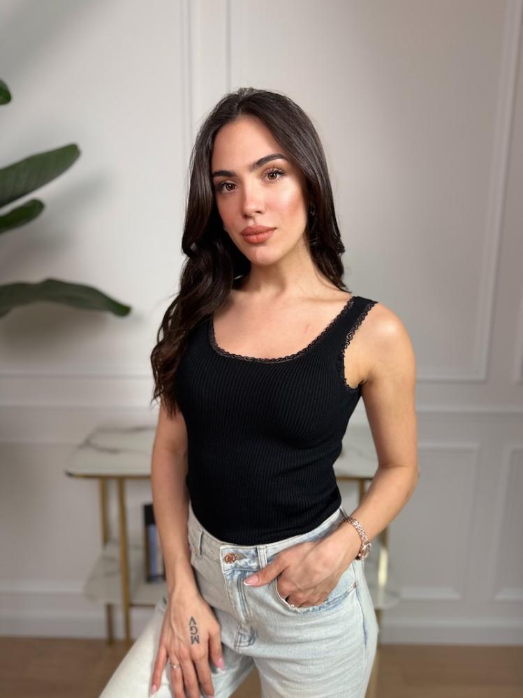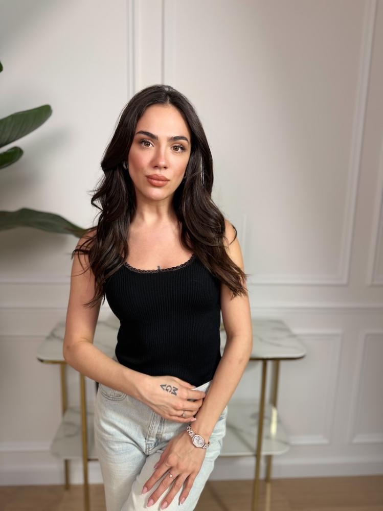 Jemná okrajová čipka dodáva tielku ženský a elegantný detail, ktorý z neho robí nielen základný, ale aj štýlový kúsok. Skvelo sa hodí pod sako, sveter alebo na samostatné nosenie počas teplejších dní.