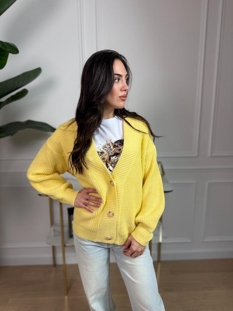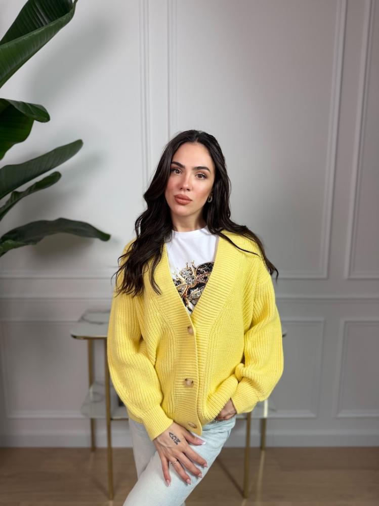 Sveter má voľnejší, mierne oversize strih, ktorý pôsobí ležérne a moderne. Zapínanie na gombíky dodáva modelu nadčasový charakter a umožňuje nosenie otvorený aj zapnutý. Perfektne sa kombinuje s tričkom, topom aj blúzkou.