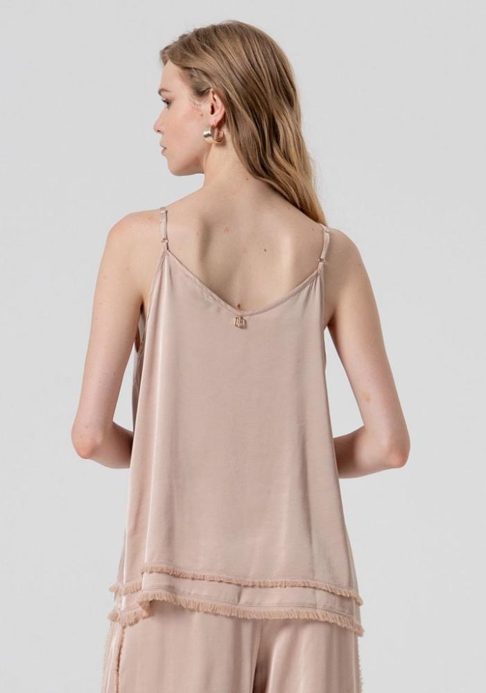 Model sa vyznačuje voľným, vzdušným strihom s tenkými ramienkami a rafinovaným výstrihom do V, ktorý decentne zvýrazňuje dekolt. Absolútne výnimočným prvkom je asymetrický vrstvený spodný lem s originálnym strapkaným zakončením, vďaka čomu top naberá jedinečný a neopozeraný charakter.