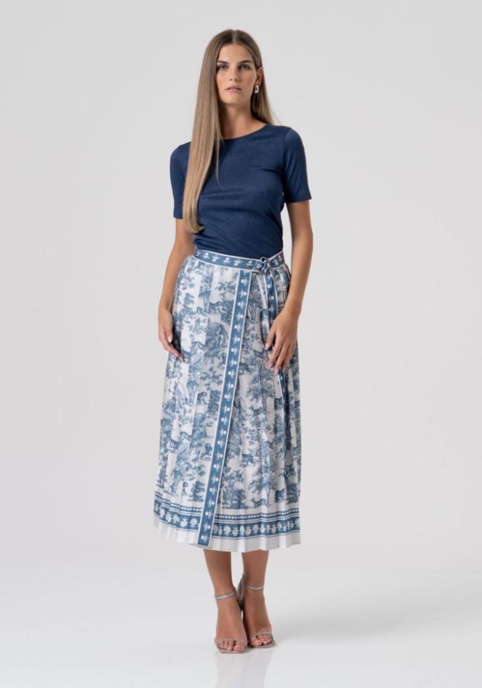 Model upúta pozornosť svojou sýtou tmavomodrou farbou obohatenou o efektné trblietavé vlákno. Vďaka tomuto prevedeniu materiál krásne odráža svetlo a jemne sa ligoce pri každom vašom pohybe. Klasický, na telo priliehajúci strih s pohodlným okrúhlym výstrihom a krátkymi rukávmi zaručí, že sa v ňom budete cítiť nielen nesmierne šik, ale aj absolútne komfortne.
