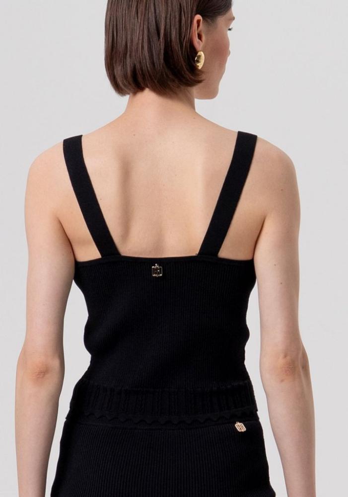 Dokonalý spoločník k elegantnej sukni a kúsok, ktorý okamžite povýši váš outfit na novú úroveň. Tento čierny úpletový top od značky Fracomina je stelesnením rafinovanej ženskosti a prepracovaných detailov, ktoré si jednoducho zamilujete.