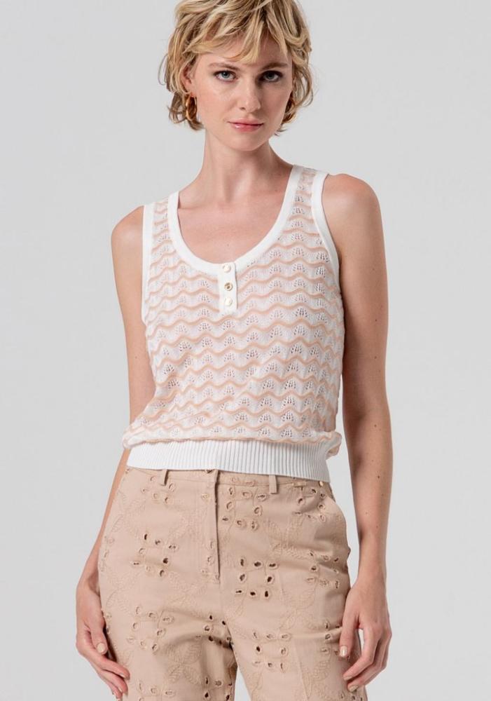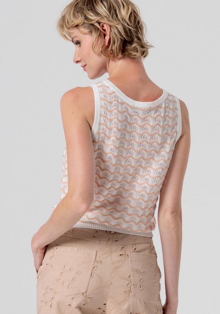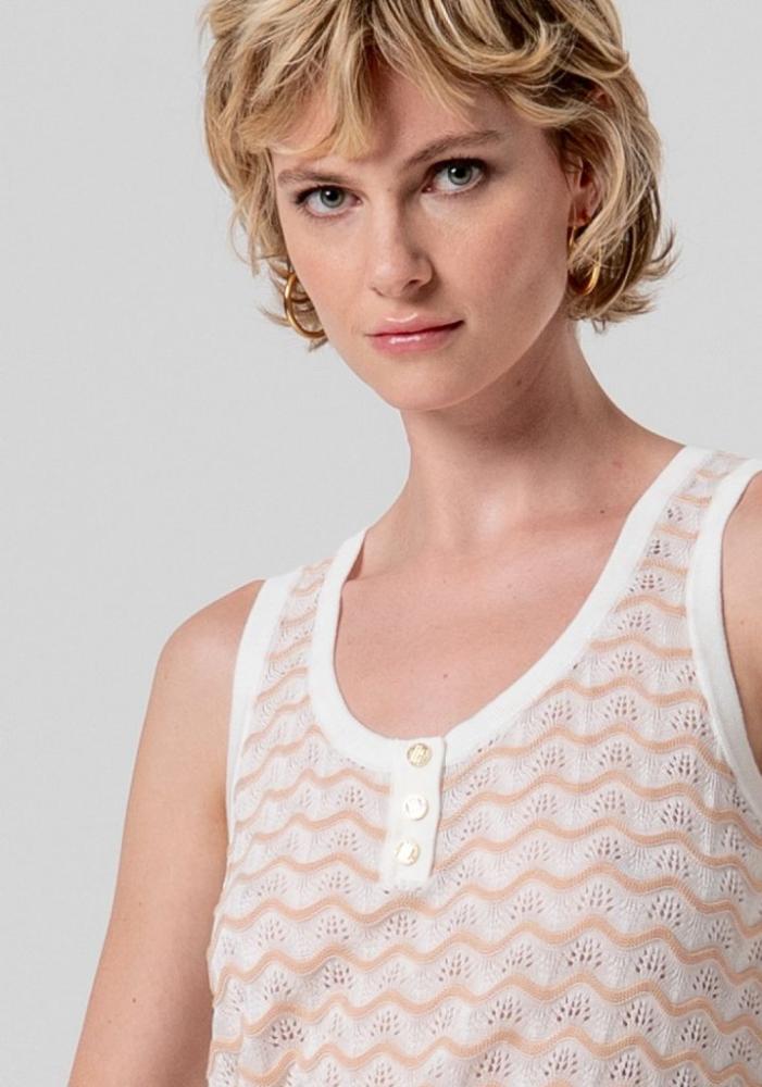 Model upúta pozornosť na prvý pohľad svojím rafinovaným, jemne perforovaným materiálom s originálnym vlnovkovým vzorom, ktorý mu dodáva vizuálnu ľahkosť a krásnu textúru. Klasický okrúhly výstrih je štýlovo doplnený o krátke zapínanie na tri drobné gombíky, čo vnáša do dizajnu jemný a veľmi aktuálny retro nádych. Celkovú siluetu krásne formuje a uzatvára širší, čisto biely rebrovaný lem v spodnej časti, ktorý zaisťuje perfektné prispôsobenie.