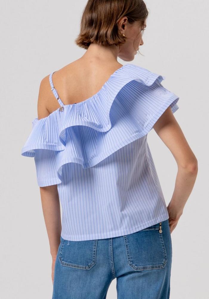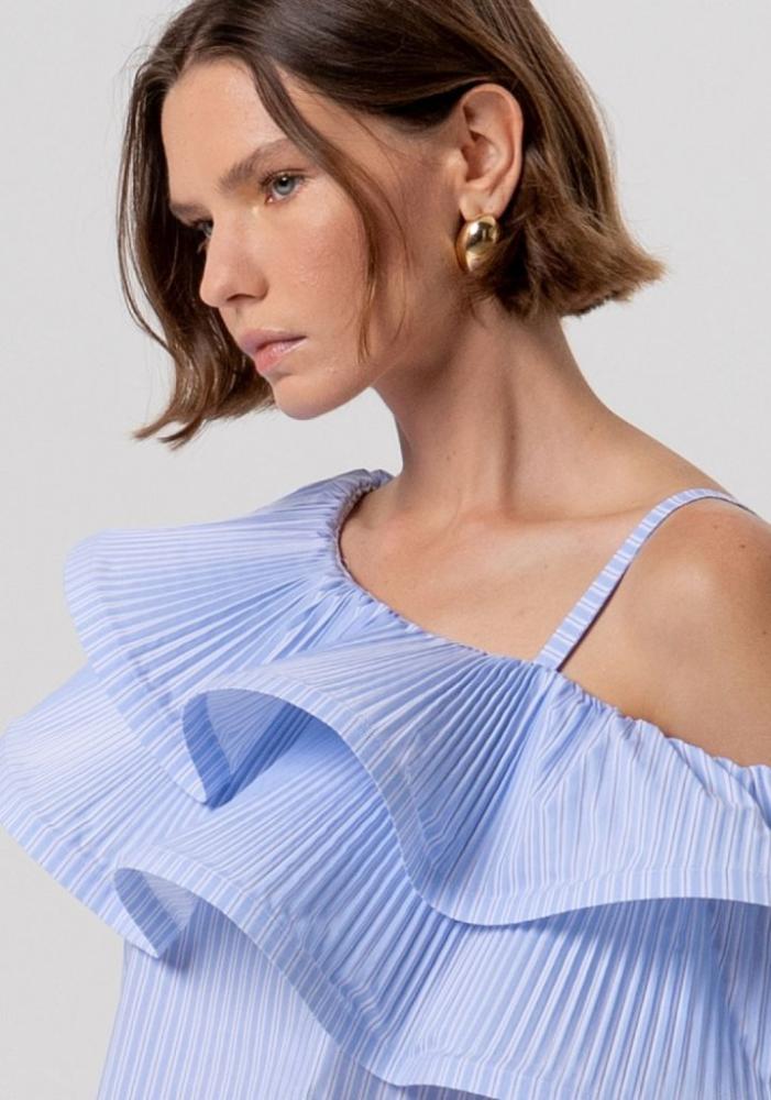Model si vás okamžite získa svojím nápaditým asymetrickým strihom. Kým jedno rameno rafinovane odhaľuje, na druhej strane ho drží na mieste jemné špagetové ramienko. Skutočným šperkom a dominantou tohto kúsku je však masívny, bohato riasený dvojitý volán, ktorý asymetricky lemuje líniu dekoltu a ramien. Tento volán je navyše spracovaný v precíznom plisé (naskladanom) dizajne, vďaka čomu top získava nádherný objem, štruktúru a dynamiku pri každom pohybe. Nadčasový vzor jemných svetlomodrých a bielych vertikálnych pásikov pôsobí mimoriadne sviežo a voľnejší strih zaručuje maximálne pohodlie a vzdušnosť aj počas horúcich letných dní.