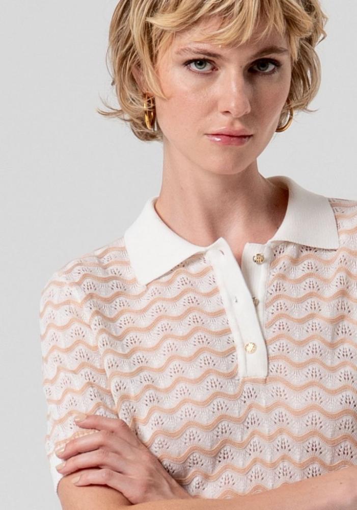 Model si vás okamžite získa rafinovaným, jemne perforovaným materiálom s originálnym vlnovkovým vzorom, ktorý mu dodáva vizuálnu ľahkosť a krásnu textúru. Klasický golierik v štýle polo košele je doplnený o elegantné zapínanie na drobné gombíky, čo vnáša do dizajnu sofistikovaný retro nádych. Celkovú siluetu krásne formujú čisté biele rebrované lemy na rukávoch a v spodnej časti, ktoré zaisťujú perfektné prispôsobenie.