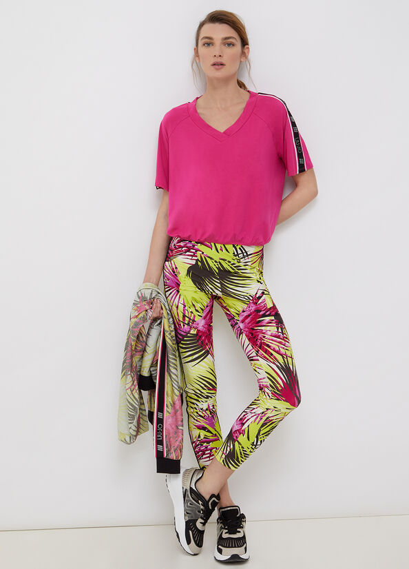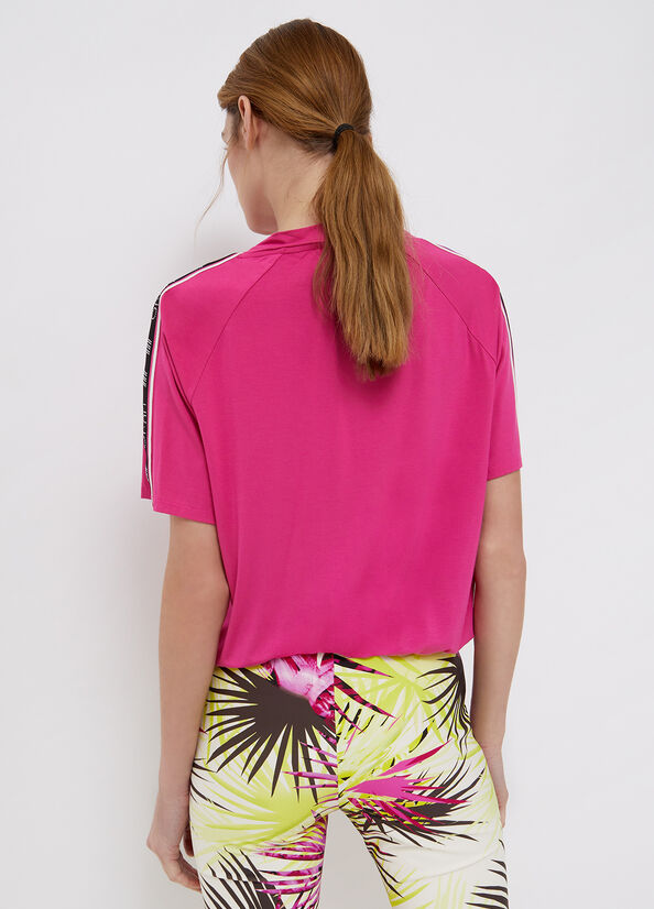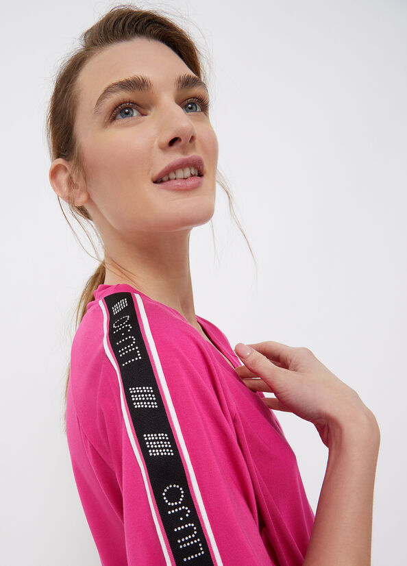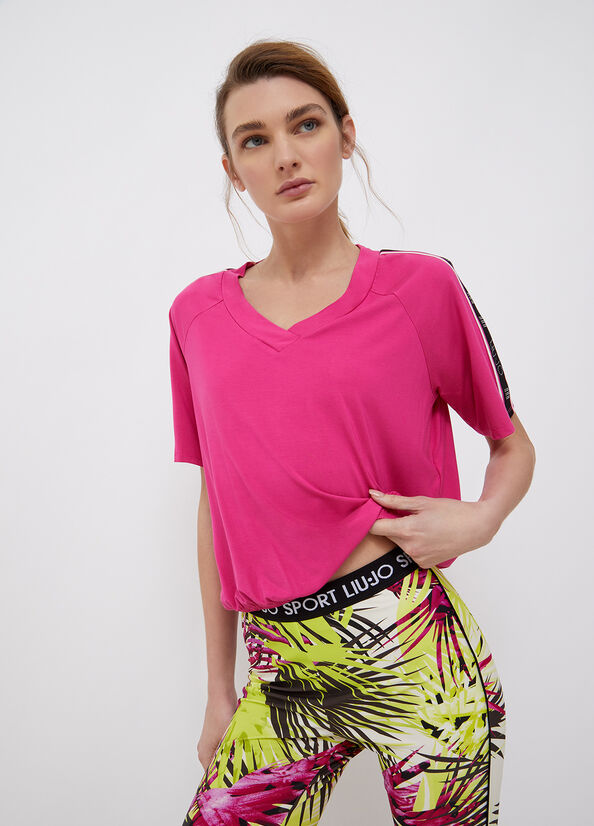 Elastické tričko s krátkym rukávom Liu Jo. V-výstrih na prednej strane. Na pleciach a rukávoch pás s logom a aplikáciou strieborných kamienkov. Strečový pás s gumičkou na spodku trička.