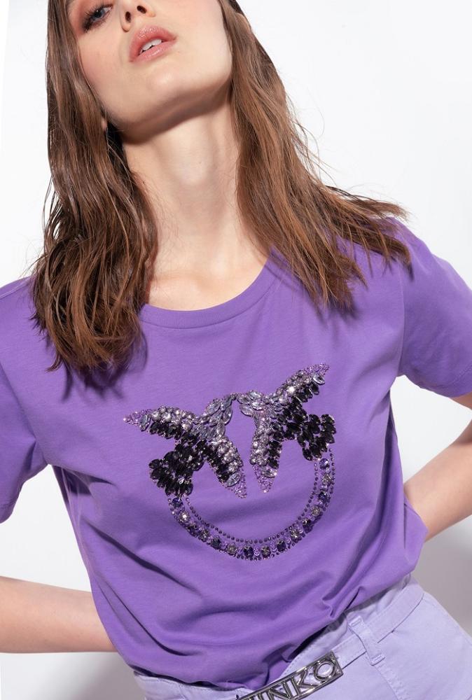 Bavlnené džersejové tričko s krátkym rukávom a veľkým vyšívaným drahokamovým logom Love Birds vpredu.