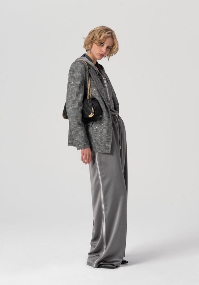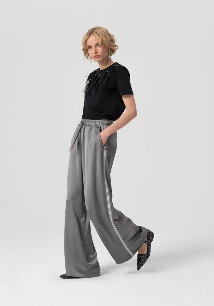 Tieto široké nohavice Fracomina v rovnakom saténovom prevedení dokonale dopĺňajú mikinu z kolekcie.