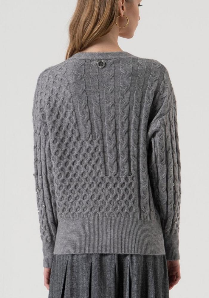 Dámsky kardigan Fracomina v sivej farbe. Mierne predĺžený srih. S kamienkami a aplikáciami