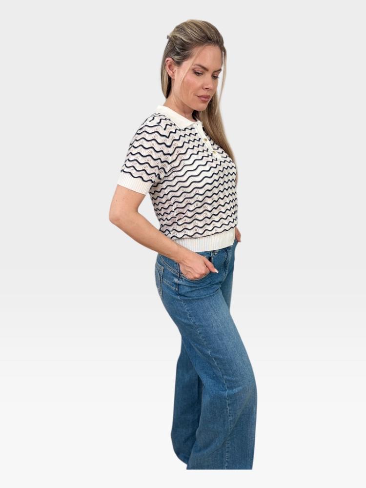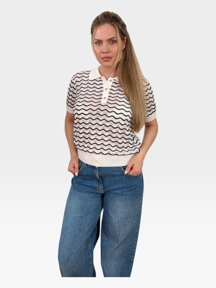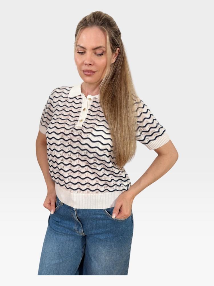 Model si vás okamžite získa rafinovaným, jemne perforovaným materiálom s originálnym vlnovkovým vzorom, ktorý mu dodáva vizuálnu ľahkosť a krásnu textúru. Klasický golierik v štýle polo košele je doplnený o elegantné zapínanie na drobné gombíky, čo vnáša do dizajnu sofistikovaný retro nádych. Celkovú siluetu krásne formujú čisté biele rebrované lemy na rukávoch a v spodnej časti, ktoré zaisťujú perfektné prispôsobenie.