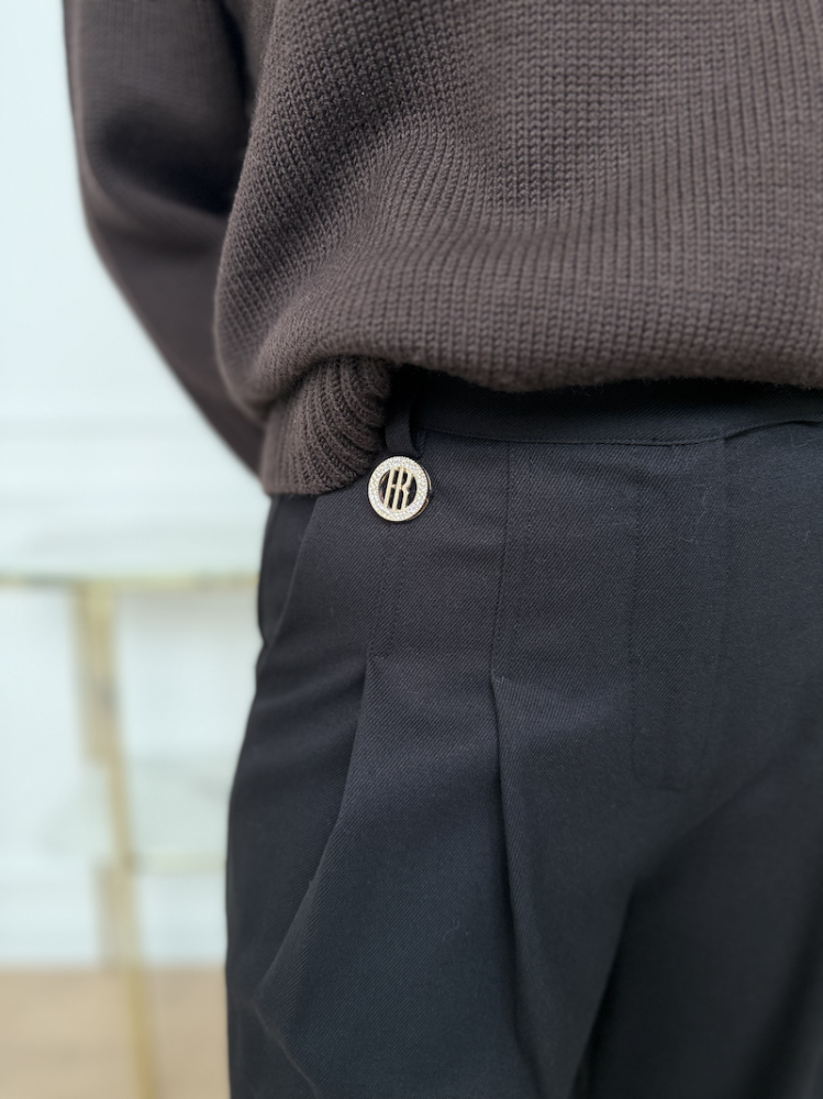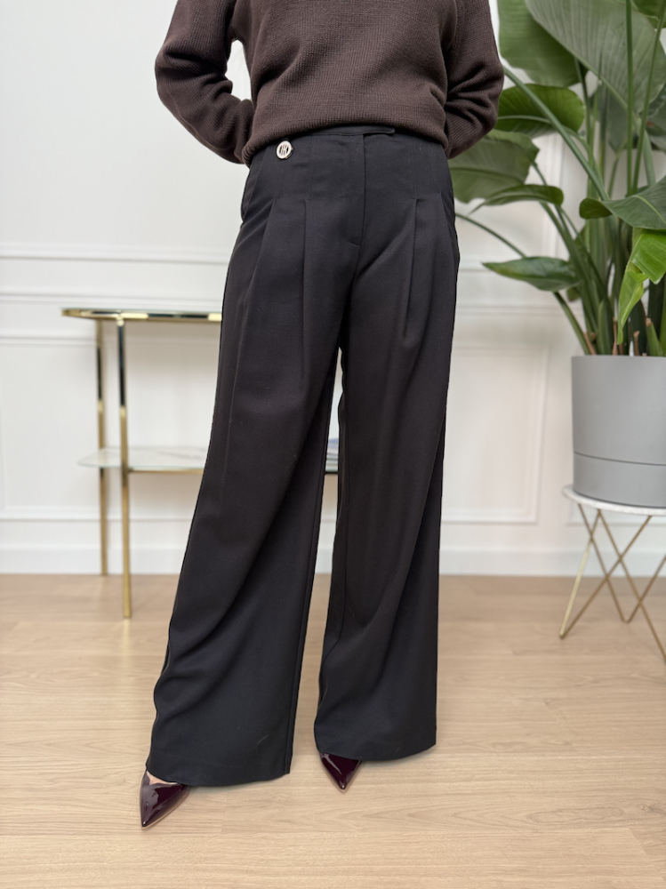 Tieto elegantné nohavice Fracomina s podielom vlny sú ideálnym kúskom pre chladnejšie obdobie. Kvalitný materiál s jemnou štruktúrou poskytuje komfort, hrejivosť a zároveň udržuje dokonalý tvar počas nosenia. Širší, voľný strih dodáva outfitu moderný a uvoľnený vzhľad, zatiaľ čo precízne spracovanie zaručuje prémiový dojem.