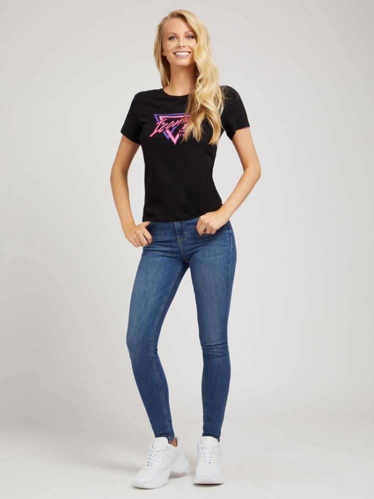 Tričko Guess s výraznou potlačou Iconic. Tričko s krátkym rukávom a okrúhlym výstrihom. Úzky strih s dĺžkou do pása.