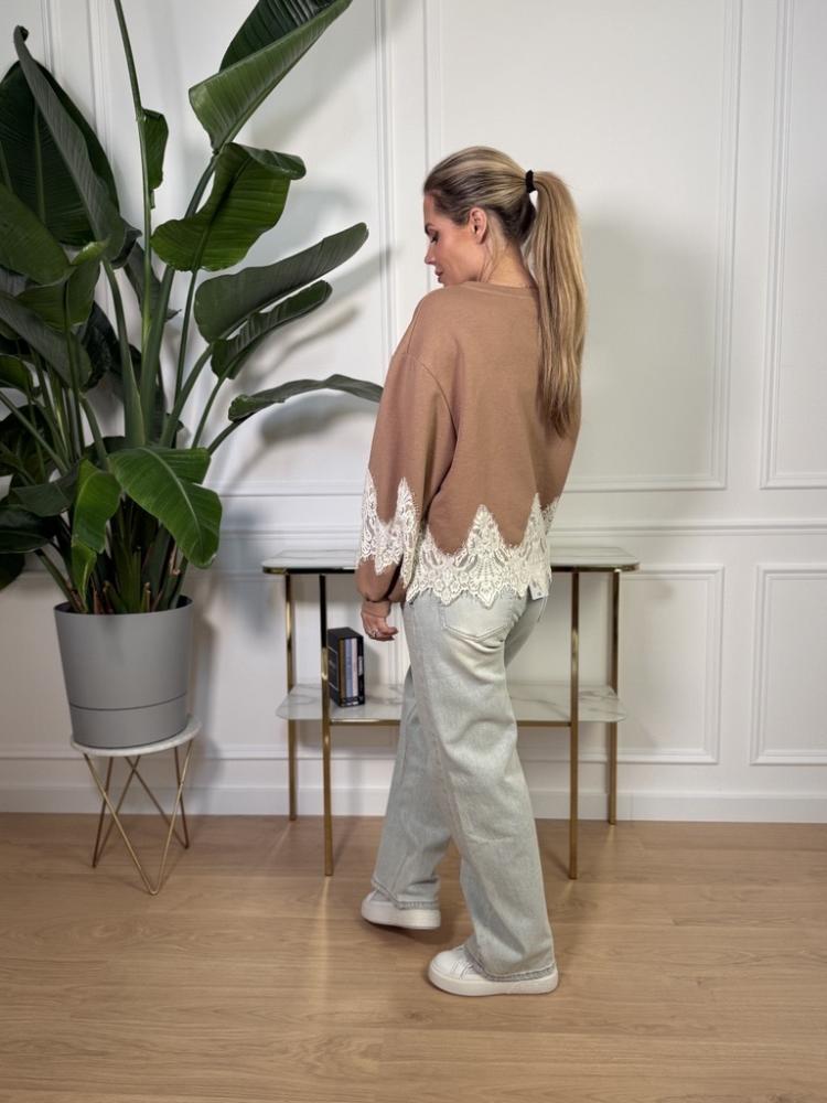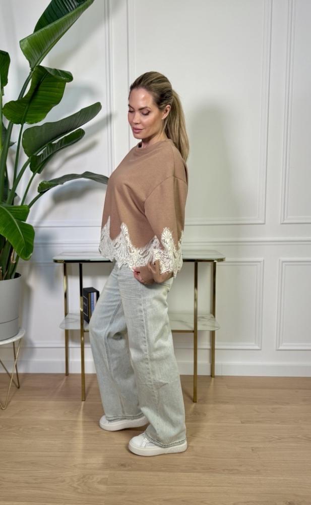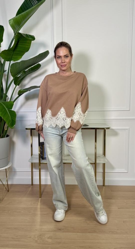 Štýlová mikina, ktorá spája pohodlie s jemnou eleganciou. Táto oversize mikina v neutrálnom béžovom odtieni je ideálnou voľbou na každodenné nosenie. Vďaka voľnému strihu poskytuje maximálny komfort a zároveň pôsobí moderne a ležérne. Výnimočným detailom je romantická čipka v spodnej časti a na rukávoch, ktorá dodáva kúsku ženskosť a originalitu.