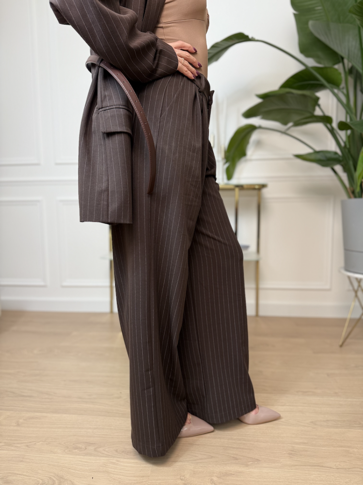 Objavte elegantné nohavice JOLEEN, ktoré spájajú pohodlie a moderný biznis štýl. Tmavohnedá farba s jemným pin-stripe pruhovaním vytvára prémiový vzhľad a pôsobí nadčasovo. Nohavice majú široký, voľný strih, ktorý krásne predlžuje postavu a dodáva outfitu módnu ľahkosť.