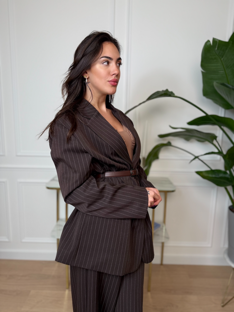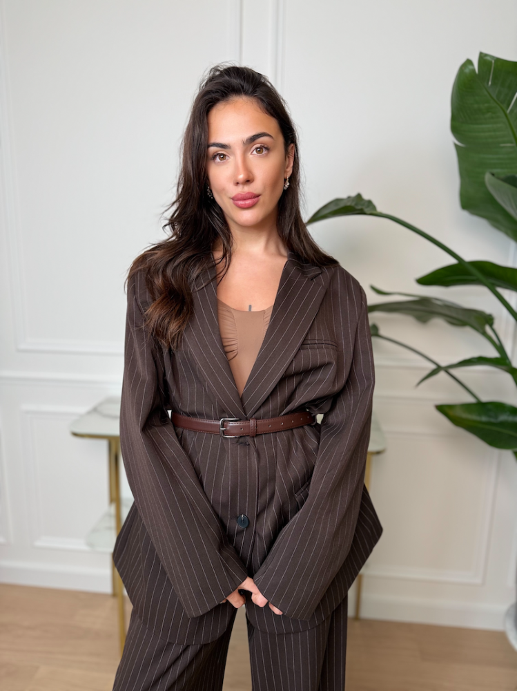Sako JOLEEN je stelesnením modernej elegancie so štipkou trendovosti. Tmavohnedá farba s jemnými prúžkami vytvára profesionálny a nadčasový vzhľad. Sako má oversize strih, ktorý dodáva outfitu uvoľnený, no stále veľmi luxusný efekt.