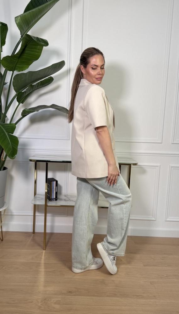 Štýlové dámske sako v nadčasovom minimalistickom prevedení, ktoré perfektne doplní každý outfit. Má voľnejší, mierne oversized strih, krátky rukáv a klasické zapínanie na gombíky, vďaka čomu pôsobí moderne a zároveň elegantne.