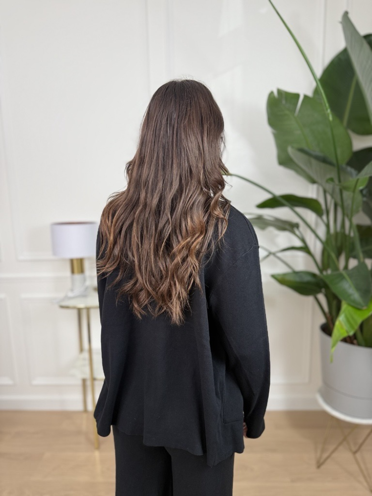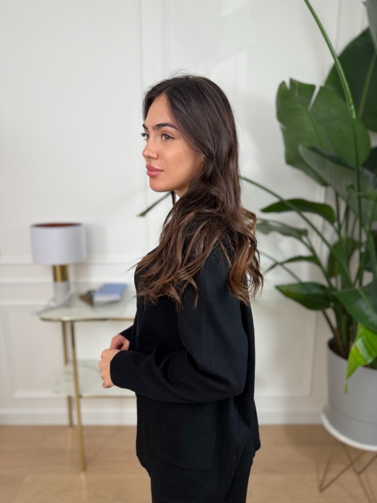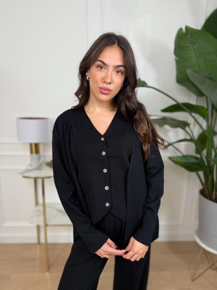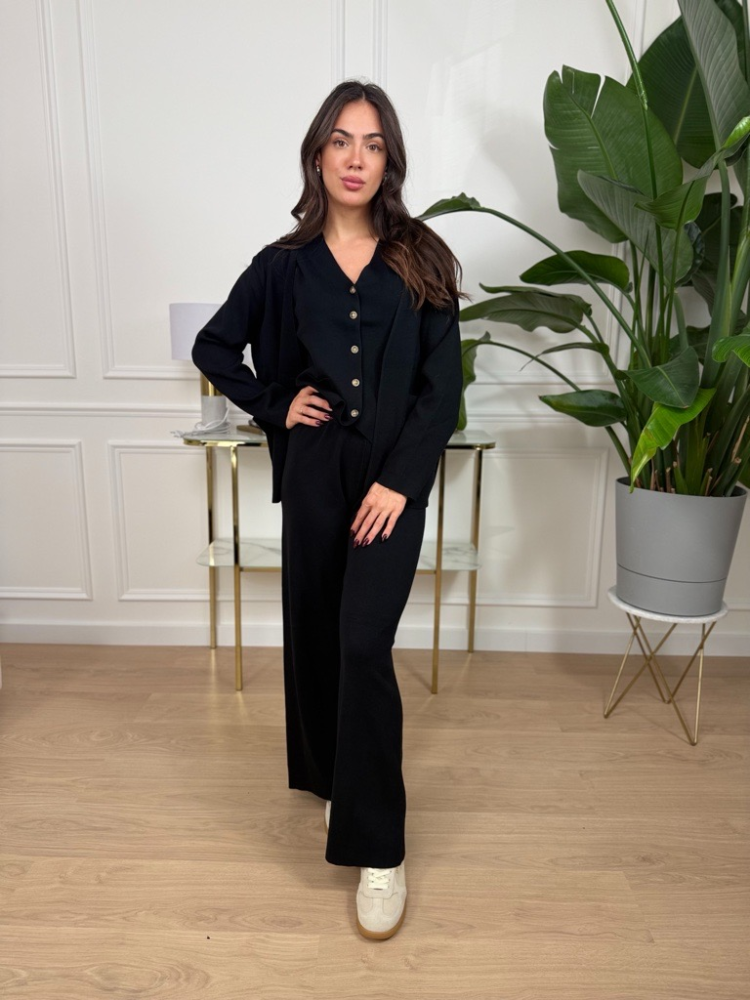 Nadčasová klasika, ktorá nikdy nesklame – čierny 3-dielny komplet Joleen tvorí elegantná vesta na gombíky, voľné nohavice a dlhá košeľa. Čierna farba pôsobí sofistikovane, opticky zoštíhľuje a ľahko sa kombinuje.