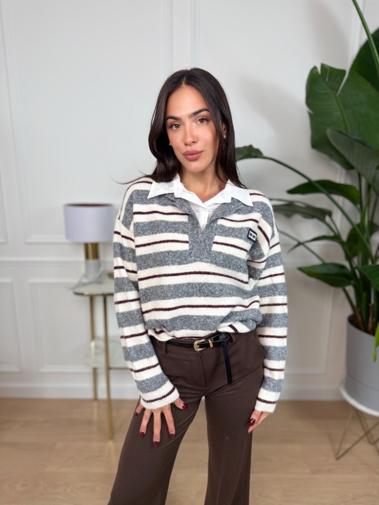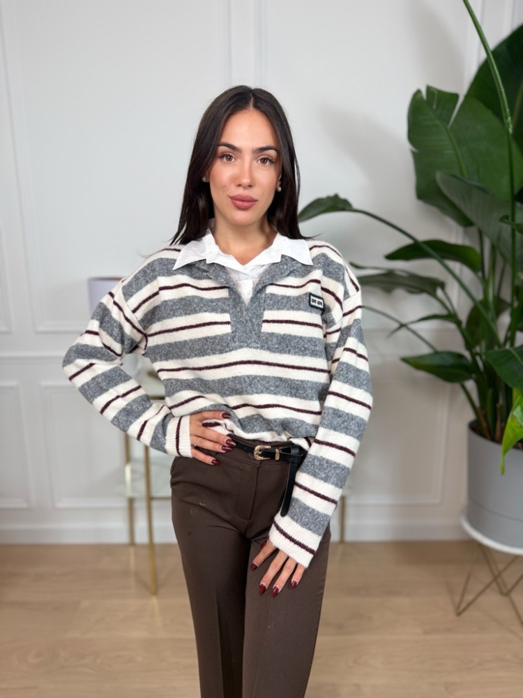 Štýlový a pohodlný sveter značky Joleen v modernom pruhovanom dizajne. Sveter kombinuje prírodné odtiene hnedej, bielej a čiernej, vďaka čomu sa ľahko kombinuje s rôznymi kúskami šatníka. Má voľnejší strih, príjemný na nosenie, a zapínanie pri krku na gombík s jemným golierikom, ktorý dodáva elegantný vzhľad.