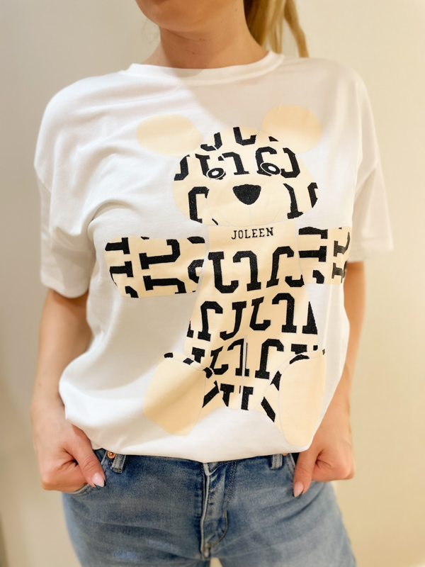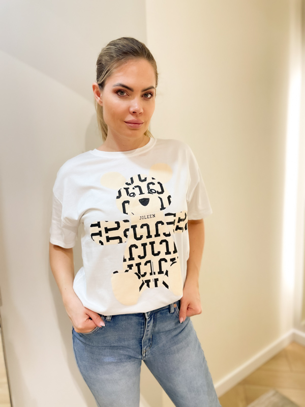Joleen trendy tričko s potlačou s mackom a nápismi. Poholdný strih a príjemná bavlna. Oversize Uni strih sadne od XS po L.
