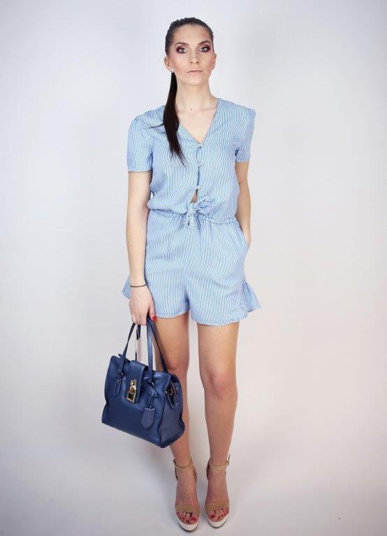 PREVEDENIE: Patrizia Pepe overal modrý s bielymi pásikmi, gombíky na zapínanie, uzol na viazanie v páse, gumička v páse, jemné volány na nohaviciach, krátky rukáv.