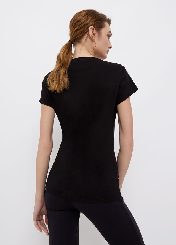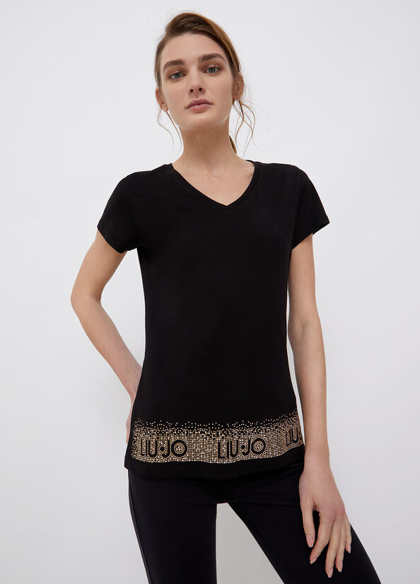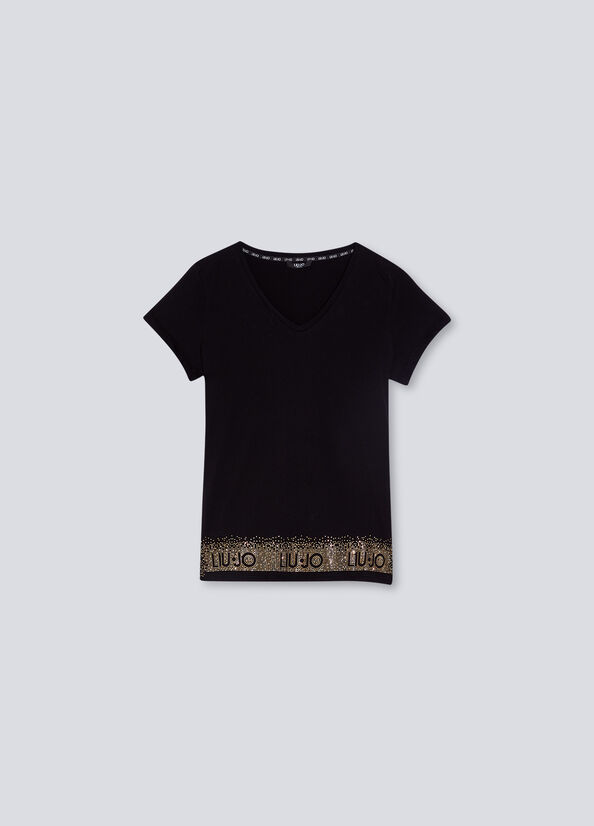 LIU JO Čierne bavlnené tričko. V výstrih. Krátke rukávy. V spodnej časti trička kamienkami vyskladaný nápis značky. Ceny sú vrátane DPH. Dostupné veľkosti uvedené v možnostiach košíka.