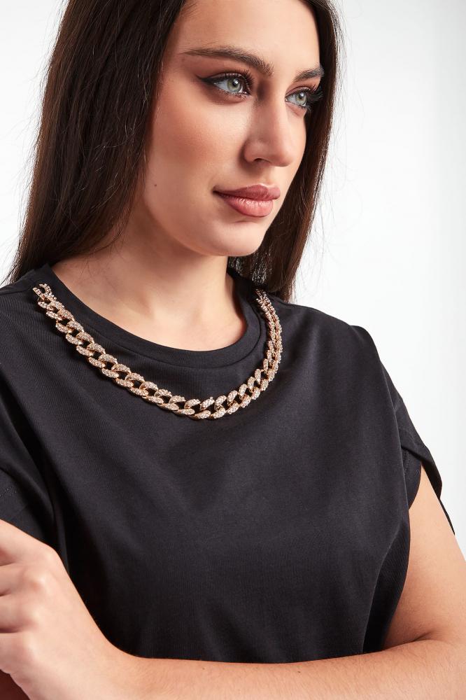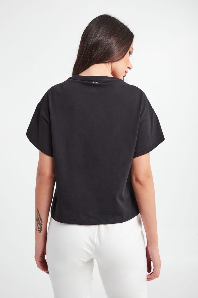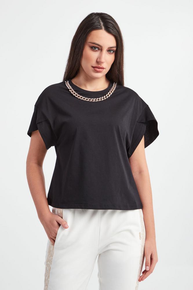 LIU JO Tričko v čiernej farbe. Klasický strih. Okrúhly výstrih. Zlatá retiazka zdobená trblietavými kryštálmi. Krátke rukávy. Vyrobené zo 100% bavlny. Dostupné veľkosti uvedené v možnostiach košíka. Ceny sú vrátane DPH.