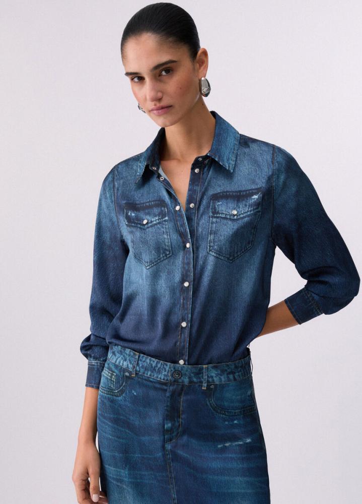 Dámska blúzka s denimovou potlačou a perleťovými gombíkmi.